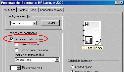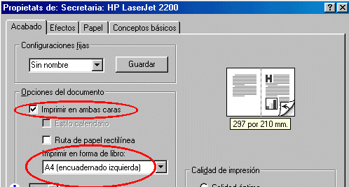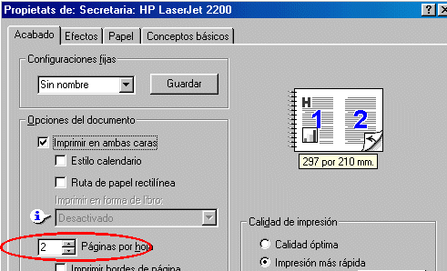 La impressora HP Laserjet 2200 instal·lada al despatx de Secretaria té unes opcions d’impressió que ens permeten estalviar paper i aconseguir impressions més manejables. Si voleu imprimir documents amb moltes pàgines és recomanable imprimir amb aquesta impressora.